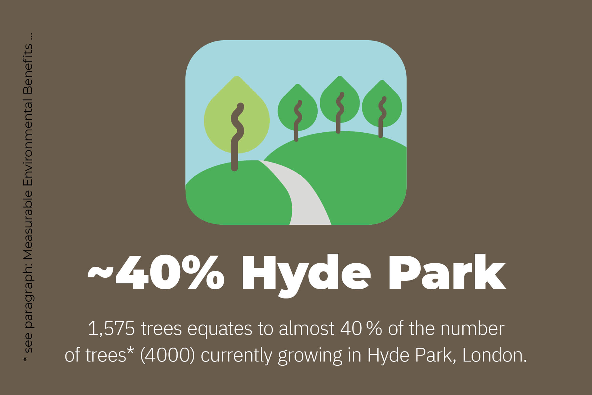- That is comparable to approximately 40% of the trees currently growing in Hyde Park in London (~4,000)c), one of Europe’s most renowned green spaces.