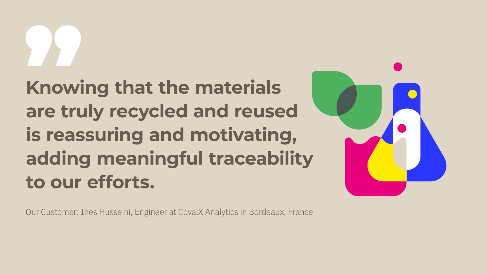 A lab in France is also part of the circular movement: ‘Our decision to join the recycling service was motivated by our commitment to reducing plastic waste and adopting closed-loop recycling. From the very beginning, the experience has been smooth, with a simple collection process and efficient logistics that do not disrupt the laboratory’s operations. This service plays a crucial role in our sustainability strategy by significantly reducing plastic waste. Knowing that the materials are truly recycled and reused is reassuring and motivating, adding meaningful traceability to our efforts’, emphasises Ines Husseini, Microbiology & Immunology Engineer at CovalX Analytics in Bordeaux.