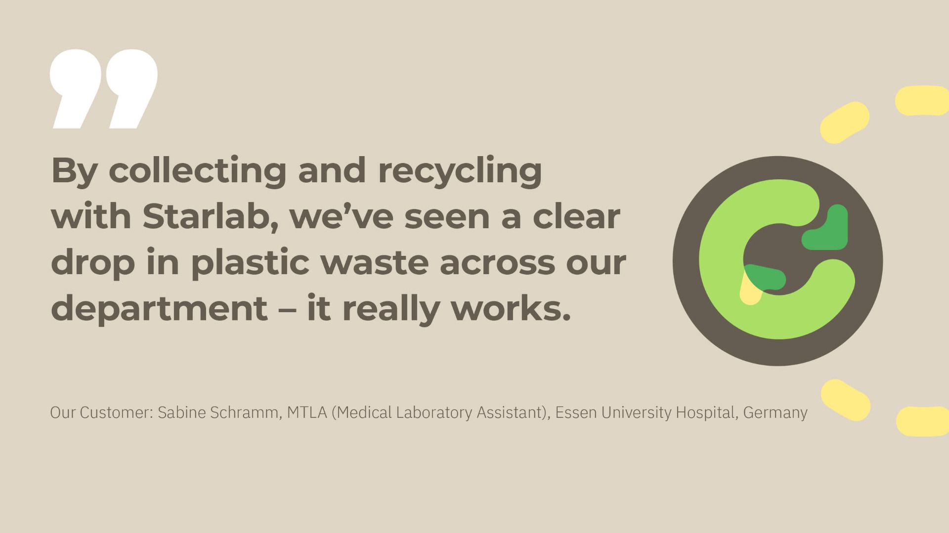 Positive feedback has also been received from Germany: ‘Over the last few years, it has become clear that the separate collection and recycling via Starlab has resulted in significantly less plastic waste in our department that has to be disposed of. I was even able to motivate colleagues from other departments in our institute to join in the collection’, reports Sabine Schramm, Medical Laboratory Assistant (MTLA, Medizinisch-technische Laboratoriumsassistentin) in the Rebmann working group at Essen University Hospital.